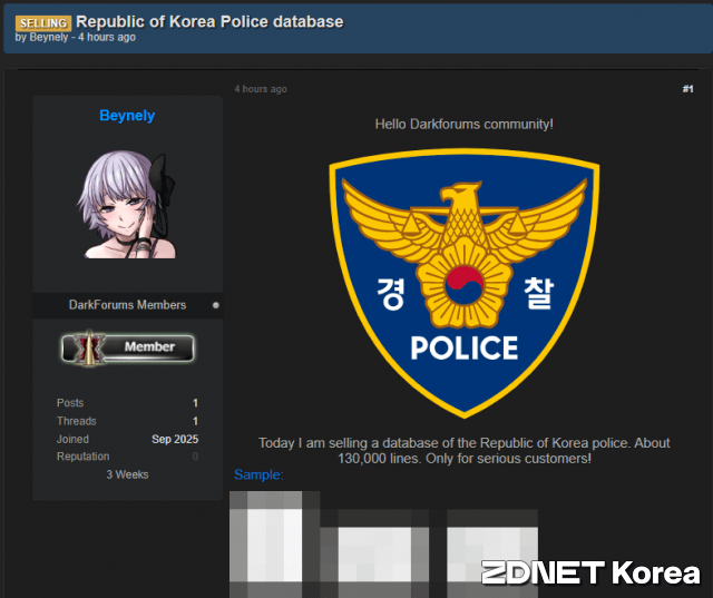 "한국 경찰 데이터 13만개를 판매합니다. 구매할 사람만 연락주세요"