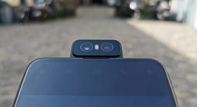 이 카메라는 DJI 오즈모 포켓 위에 있는 미니 짐벌 카메라와 매우 비슷해 보인다. 메인 카메라가 위로 젖혀져 셀카를 찍을 수 있을 뿐 아니라 로봇 팔이 움직이며 다양한 위치와 각도에서 촬영이 가능하다. 이는 전면 카메라를 위로 젖혀 셀카를 찍었던 2019년 출시된 에이수스 젠폰6의 진화된 버전이다.