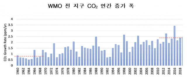 세계기상기구(WMO)가 15일(현지시간) 발표한 온실가스연보에 따르면 지난 10년(2011~2020년) CO2 평균 연간 증가폭은 1960년대의 0.8ppm 보다 3배 높은 24ppm으로 나타났다. 증가폭 3.3ppm을 기록한 2015~2016년 CO2 연간 증가폭에 이어 두 번째로 높은 수치다.