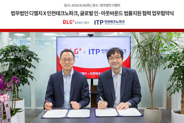 법무법인 디엘지(DLG Law Corporation, 대표변호사 조원희·안희철)는 인천테크노파크(인천TP, 원장 이주호)와 함께 ‘글로벌 스케일업 캠퍼스’ 사업 일환으로, 기술혁신기업의 글로벌 진출·입을 지원하기 위한 업무협약을 체결했다고 17일 밝혔다.