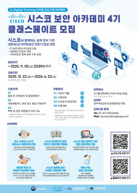 한국전파진흥협회(RAPA)는 사이버 보안 인재 양성을 위해 ‘시스코 보안 아카데미 4기’ 교육생 모집을 진행한다고 밝혔다.