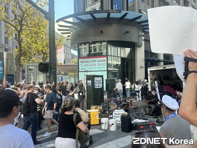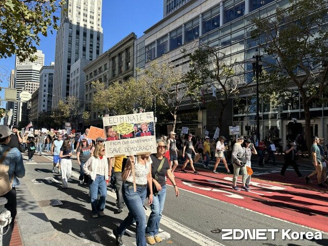 [샌프란시스코(미국)=김미정 기자] 도널드 트럼프 미국 대통령의 군 투입 경고에 항의하는 대규모 시위가 샌프란시스코 전역에서 벌어졌다. 시민들은 민주주의를 지키기 위해 연대해야 한다며 거리로 나서 목소리를 높였다.