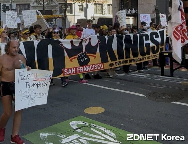18일(현지시간) 샌프란시스코 시민들은 '노 킹스(No Kings)' 시위를 열고 트럼프 행정부의 권위주의적 행보에 반대 의사를 밝혔다. 시위는 도심을 중심으로 엠바카데로에서 오션비치까지 이어졌다. 참가자들은 "트럼프를 몰아내라" "왕은 필요 없다" "민주주의를 지켜라" 등 구호를 외쳤다.