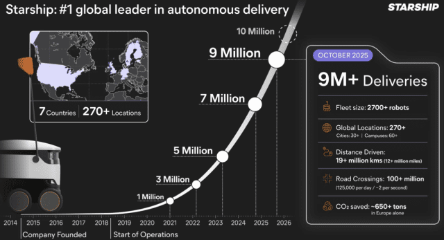 아티 하인라 CEO는 "우리는 유럽 도시 시장과 미국 대학 캠퍼스를 장악했고, 이제 미국 도시로 확장할 때"라며 "미국 소비자들은 곧 스타십 로봇을 통해 30분 이내 배송을 새로운 표준으로 경험하게 될 것"이라고 말했다.
