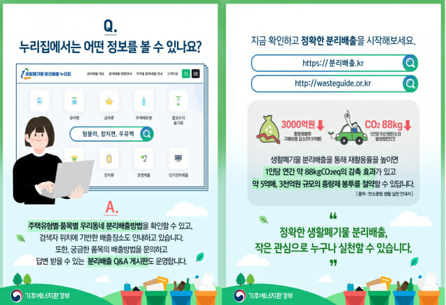 김고응 기후부 자원순환국장은 “인터넷 영상 등을 통해 분리배출에 관한 잘못되거나 자극적인 정보가 퍼지면 관련 정책의 실효성이 떨어진다”며 “생활폐기물 분리배출 제도가 전국 기초 지자체에서 합리적으로 운영될 수 있도록 카드뉴스 배포 등 ‘생활폐기물 분리배출 누리집’에 대한 홍보를 더욱 강화하겠다”고 밝혔다.