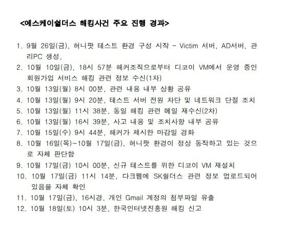SK쉴더스는 9월 26일 해커를 유인하기 위한 가상 환경인 '허니팟' 테스트 환경을 구성하고 Victim 서버, AD서버, 관리PC를 생성했다. 그런데 보안 테스트 중 개인 메일함(Gmail) 자동 로그인 설정으로 인해 해킹정보가 발생했고, 실제 해커조직으로부터 10월 10일 해킹 관련 정보를 1차로 수신했다. 해커를 유인하기 위한 가상 공간을 만들었는데 오히려 해커에게 해킹을 당한 것이다. 이에, SK쉴더스는 10월 13일 오전 8시에 관련 내용을 내부에 공유하고 오전 9시 20분에 테스트 서버 차단 및 단절 조치를 취했다.