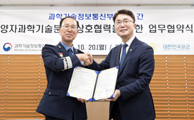 과학기술정보통신부 류제명 제2차관과 공군 손석락 참모총장(대장)은 20일 킨텍스에서 양자과학기술분야 상호협력을 위한 업무협약을 체결했다.