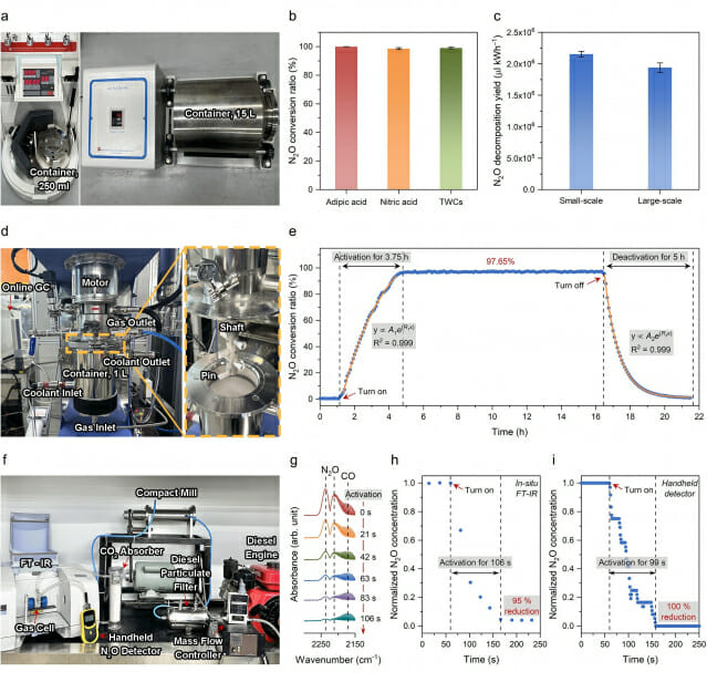 연구팀은 지름 수 밀리미터의 구슬을 넣은 반응 용기(볼밀)에 니켈산화물(NiO) 촉매와 아산화질소 가스를 함께 넣고 흔드는 방식을 사용해 아산화질소를 분해해 냈다. 구슬의 충돌과 마찰로 니켈산화물 촉매 표면에 고밀도 결함과 초산화(ultra-oxidized) 상태가 형성되는데, 이로인해 기존 열촉매로는 불가능했던 저온·고속 분해가 가능하다.