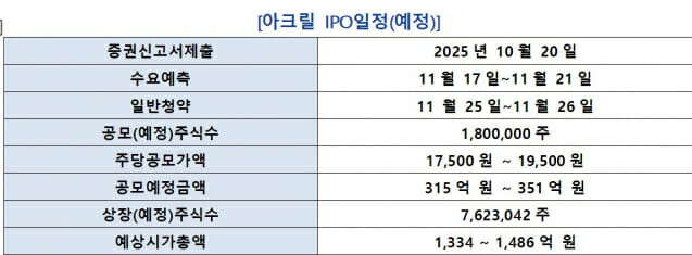 21일 아크릴에 따르면, 이번 상장을 통해 이 회사는 총 180만 주를 공모할 예정이다. 희망 공모가 밴드는 1만7500원~1만9500원이다. 총 공모 예정금액은 315억 원~351억 원 규모다. 오는 11월 기관투자자 대상 수요예측과 일반 청약을 거쳐 연내 상장을 목표로 하고 있다.