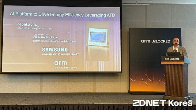 이어 국내 팹리스 반도체 업체 리벨리온이 개발한 AI 추론 특화 반도체 '립프로그'(Leapfrog)를 예로 들며 "립프로그는 Arm의 네오버스 반도체 IP, 삼성전자 파운드리의 2나노급 제조 기술, 에이디테크놀로지의 칩렛 설계 기술 기반으로 구성된 ATD 협력의 대표적 성과"라고 설명했다.