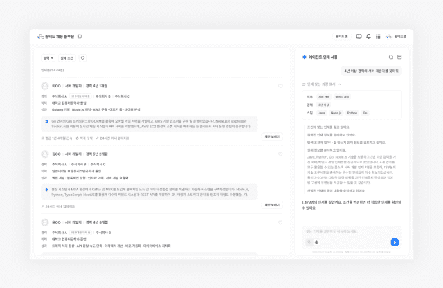 예를 들어, “리액트 경험 3년 이상, 타입스크립트 가능, 커뮤니케이션 능력이 뛰어나며 새로운 기술 학습에 적극적인 프론트엔드 개발자를 찾고 있다”라고 입력하면 AI가 즉시 조건을 이해하고 최적의 후보자를 탐색한다.