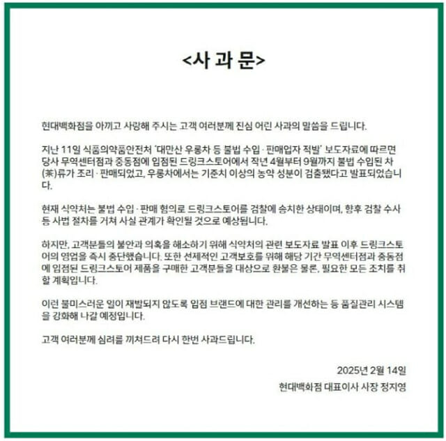 현대백화점은 정 대표 명의의 사과문을 홈페이지에 게시해 영업 중단과 함께 고객 환불 조치를 시행했다.