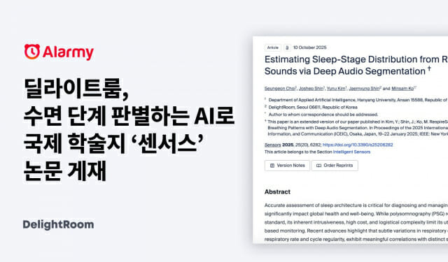 수면-기상 솔루션 '알라미' 운영사 딜라이트룸(대표 신재명)이 수면 호흡 분석을 통한 수면 단계 판별 인공지능(AI) 모델에 대한 연구 논문을 센서 기술 분야 SCI급 국제 학술지 ‘센서스’에 발표했다.