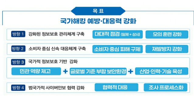 이번 '범부처 정보보호 종합대책'의 네가지 추진 방향은 ❶국민 생활에 밀접한 핵심 IT 시스템의 대대적인 보안 점검 추진 ❷소비자 중심의 사고 대응 체계 구축과 재발 방지 대책 실효성 강화 ❸민·관 전반의 정보보호 역량 강화와 글로벌 기준에 부합하는 정보보호 환경 조성과 정보보호 산업·인력·기술 육성 ❹범국가적 사이버안보 협력 체계 강화 등이다.