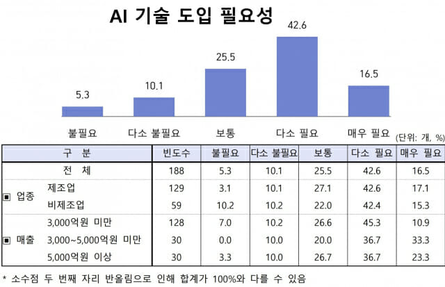 한국중견기업연합회는 ‘중견기업 AI 도입 및 활용 실태 조사’에서 중견기업의 59.1%가 AI 도입이 필요하다고 응답했다고 22일 밝혔다. 제조업(59.7%)과 비제조업(57.7%) 분야 모두 AI 도입 요구가 비슷한 수준으로 나타났다.