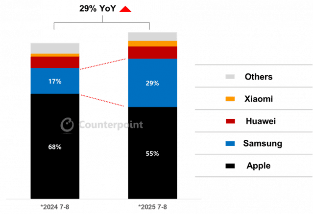 프리미엄 시장의 경쟁은 한층 치열해졌다. 삼성전자는 갤럭시S25 시리즈 판매 호조에 힘입어 700~999달러 가격대 프리미엄 스마트폰 시장에서 점유율을 10%포인트 이상 끌어올렸다.