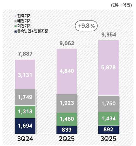 3분기 전력기기 부문 매출은 5천878억원으로 전분기 대비 21.4% 증가, 전년 동기 대비로는 87.7%의 높은 성장률을 보였다.