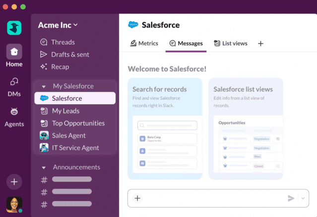 슬랙은 '에이전틱 운영체제(OS)'를 공개하고 세일즈포스의 영업·인사·IT·데이터 분석 기능을 한 대화창 안에서 처리할 수 있도록 통합했다. 사용자는 별도 화면 전환 없이 자연어로 AI와 대화하며 업무를 실시간 수행할 수 있다.
