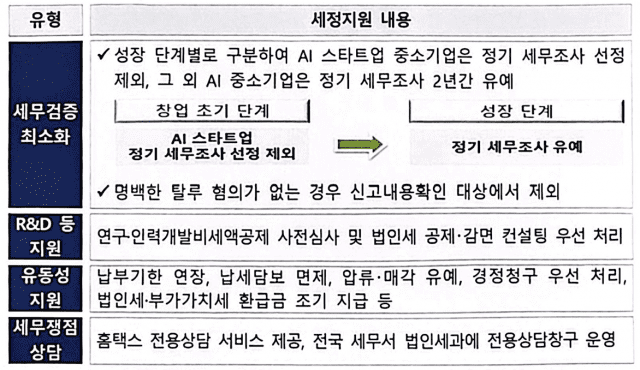 일단 국세청은 성장 단계별로 구분해 AI 스타트업 중소기업은 정기 세무조사 선정을 제외한다는 방침이다. 이 외 AI 중소기업은 정기 세무조사 착수를 유예할 계획이다. AI 스타트업 중소기업은 사업 영위 기간이 창업일부터 5년 이내인 곳이다. 유예 기간은 납세자 신청에 따라 세무조사 착수 예정일로부터 최대 2년간 적용된다.