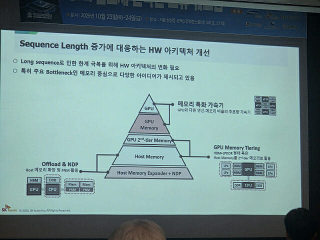 인공지능(AI)이 답을 내는 데 시간이 걸리는 진짜 이유가 ‘메모리 부족’이라 보고, SK하이닉스가 메모리 중심 가속기를 연구 중이다. 그래픽처리장치(GPU)보다 메모리를 훨씬 많이 탑재해 대형 언어모델(LLM) 추론 속도를 끌어올리겠다는 계획이다.