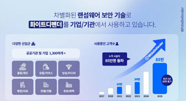 또 대기업과 중견, 중소기업을 비롯해 의료기관, 스마트팩토리 등 다양한 산업군에 폭넓게 공급, 사용되고 있다. 현재 1300여 개 고객사와 80만 명 이상 사용자가 우리 솔루션을 사용해 랜섬웨어 대응 체계를 구축했고, 연간 구독형(Subscription) 모델로 안정적인 서비스를 이용중이다. '화이트디펜더'는 국내 엔드포인트 안티랜섬웨어 시장에서 검증된 대표 솔루션으로 자리매김하고 있다."