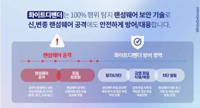 커널 단계에서는 OS의 핵심 영역 침해 및 루트킷 기반 위협을 원천 봉쇄한다. 이런 기술의 핵심은 ‘행위 탐지’다. '화이트디펜더'는 시그니처 기반 탐지 방식 대신, 랜섬웨어의 행위 패턴을 실시간으로 분석해 위협을 판단한다. 이를 통해 신종 랜섬웨어, 패턴을 은폐한 변종, 그리고 파일리스(Fileless) 공격까지 효과적으로 탐지할 수 있다.