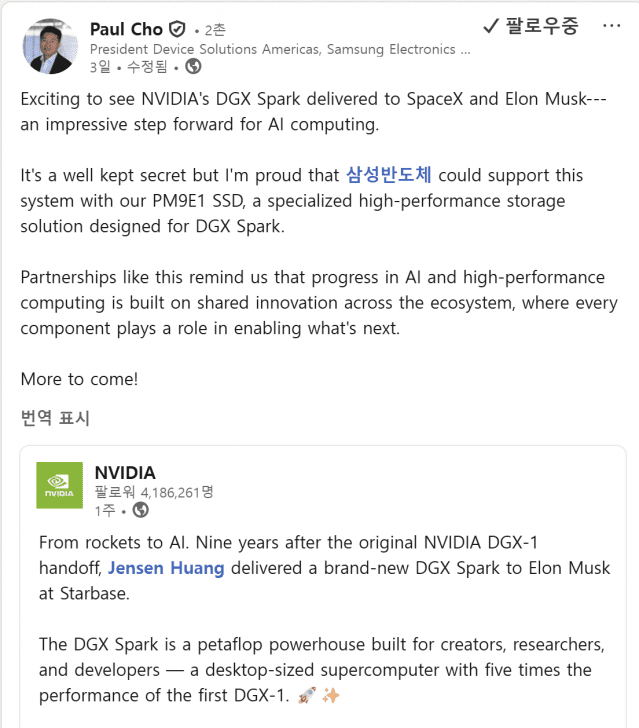 그는 “엔비디아의 DGX 스파크가 스페이스X와 일론 머스크에게 전달된 것을 보니 흥미롭다”며 “삼성 반도체가 DGX 스파크용으로 설계된 고성능 스토리지 솔루션인 PM9E1 SSD를 통해 이 시스템을 지원할 수 있었던 점이 자랑스럽다”고 밝혔다.