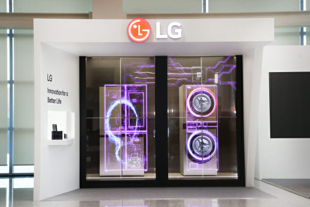 투명 올레드 사이니지 뒤에 워시타워와 냉장고 제품을 배치하고 투명한 화면 위에서 실제 제품과 영상을 매칭해 냉장고의 ‘인버터 리니어 컴프레서’, 워시타워의 ‘AI DD(Direct Drive)모터’ 등에 적용된 차별화된 AI 코어테크를 보여준다.