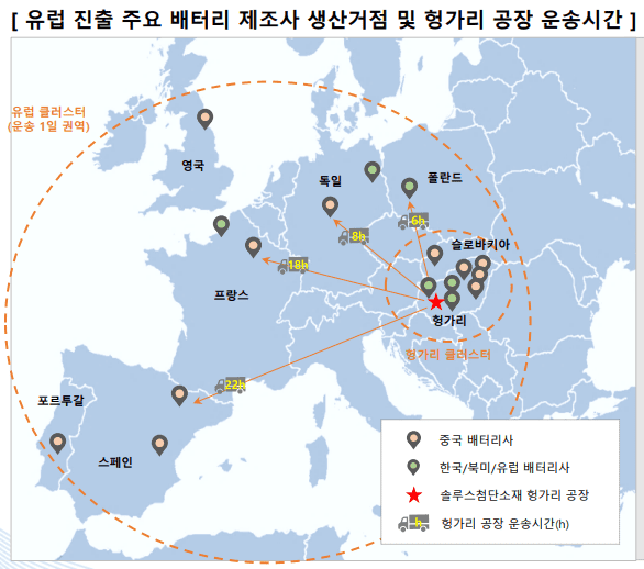 특히 솔루스첨단소재의 헝가리 전지박 공장이 유럽 내 전기차 보조금 부활과 최근 제조업 강화 정책에 따른 역내 공급망 구축 강화 흐름에 힙입어 직접적인 수혜를 받을 것으로 예상했다.