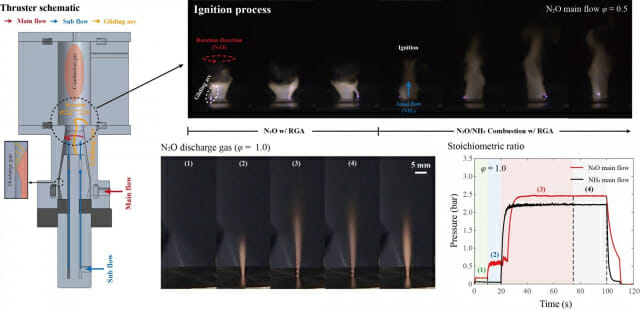 실험 결과, ‘암모니아–아산화질소’ 추진계는 기존의 ‘아산화질소–탄화수소’ 조합보다 비추력(추진 효율)은 5% 높고, 연소 온도는 5% 낮게 나타났다.