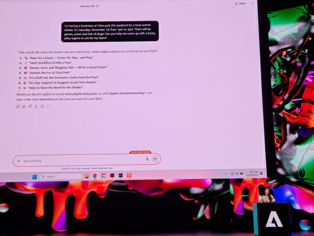 와드와니 사장은 "우리는 이 경험을 '챗GPT' 같은 인기 플랫폼에도 적용 중"이라고 밝혔다. 실제로 이날 마지막 시연자는 챗GPT 내부에서 '어도비 익스프레스' 앱을 직접 실행했다.