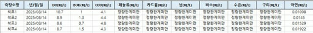 가장 최근인 지난 8월 측정 결과에 따르면, 석포2 지점의 수질은 평균 1~2급수 정도의 깨끗한 수준으로 나타났다. 용존산소(DO) 8.9mg/L, 생물화학적산소요구량(BOD) 1.3mg/L, 화학적산소요구량(COD) 4.4mg/L 등 주요 지표가 모두 기준치 이하였다. 카드뮴·비소·수은·구리 등 중금속은 검출되지 않았고, 아연 농도도 0.0145mg/L로 환경기준을 크게 밑돌았다.