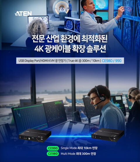 에이텐 코리아 전성훈 마케팅팀장은 "CE980·CE990은 단일 광케이블로 트루 4K HDR 영상을 비롯한 모든 KVM 신호를 완전하게 전송할 수 있는 솔루션"이라며 "복잡한 멀티 인터페이스 환경에서도 안정적인 제어와 고화질 영상 전송을 동시에 실현해 의료, 산업, 미디어 분야 고객의 운영 효율을 크게 높여줄 것"이라고 말했다.