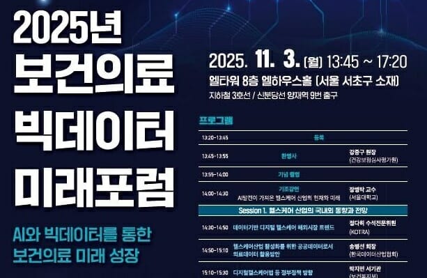 건강보험심사평가원(이하 심사평가원)은 11월3일 서울 서초구 엘타워 엘하우스홀에서 ‘2025년 보건의료 빅데이터 미래포럼’을 개최한다.