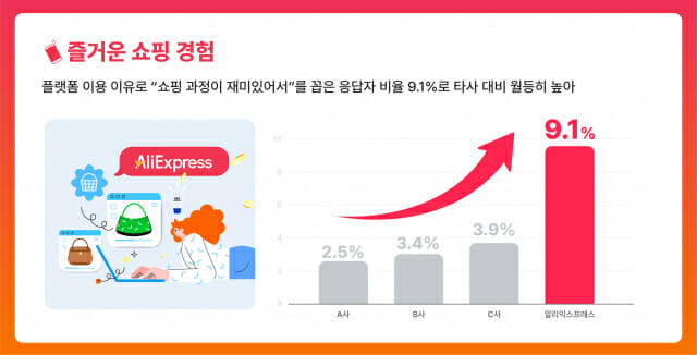 이용 패턴 분석에서도 주목할 만한 성과가 확인됐다. 최근 3개월 내 알리익스프레스 이용 경험률과 주 이용 전환율은 전년 대비 상승하며 충성 고객층이 확대되고 있는 것으로 조사됐다. 특히 30~40대 남성층에서 이용 비중이 두드러졌으며, 주요 이용 이유로는 '저렴한 가격(52.3%)', '국내에서 구할 수 없는 상품 구매(34.1%)', '신상품에 대한 호기심(4.5%)' 등이 꼽혔다. 또 '쇼핑 과정이 재미있다(9.1%)'는 항목이 경쟁 플랫폼 대비 현저히 높은 응답률을 기록해 가격 우위를 넘어선 차별화된 고객 경험이 경쟁 우위로 작용하고 있음이 입증됐다.