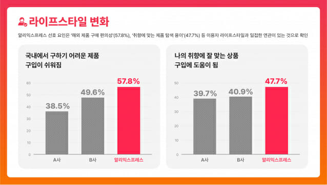 아울러 소비자들은 알리익스프레스를 통해 라이프스타일 전반에서도 긍정적인 변화를 체감한 것으로 나타났다. "새로운 상품을 더 자주 접하게 됐다", "내 취향에 맞는 제품을 쉽게 찾을 수 있다", "다양한 조리도구를 구매해 요리가 즐거워졌다", "국내에서 구하기 어려운 제품을 쉽게 구입할 수 있다" 등 생활 전반의 질적 개선을 경험했다고 응답했다.
