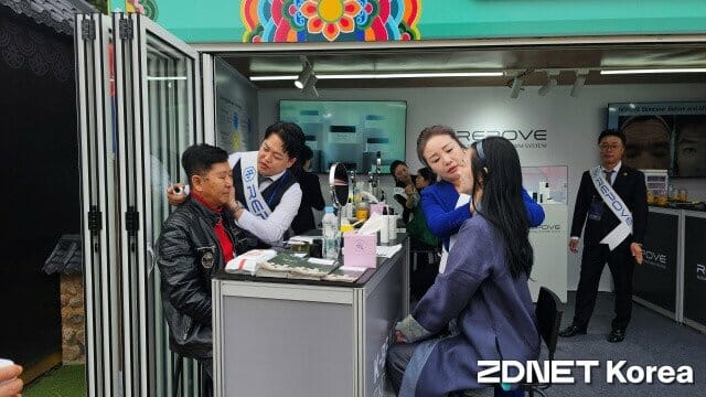 K-뷰티 부스에서는 화장품을 직접 피부에 바르며 체험하는 참가자들이 눈에 띈다. 지역 중소 화장품 기업 바이노텍 관계자는 “기술력을 인정받아 부스를 마련했다. 미국에도 진출했고 상장도 준비 중”이라고 소개했다.