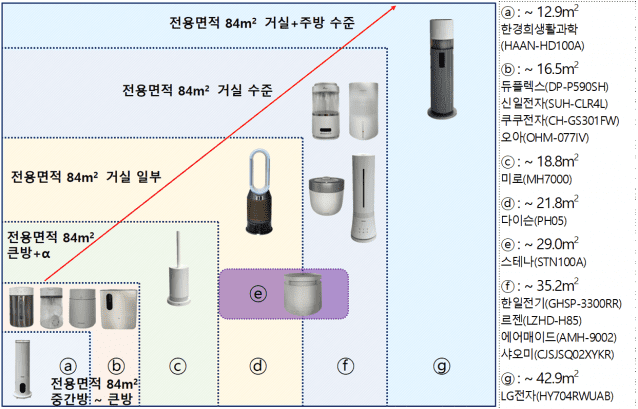 또한 공기청정기 겸용 제품의 경우 가습면적과 공기청정면적이 달라 용도에 맞는 구분 사용이 필요했다. 다이슨은 가습면적 21.8㎡, 공기청정면적 18.7㎡였으며 LG전자는 각각 42.9㎡, 17.5㎡로 측정됐다.