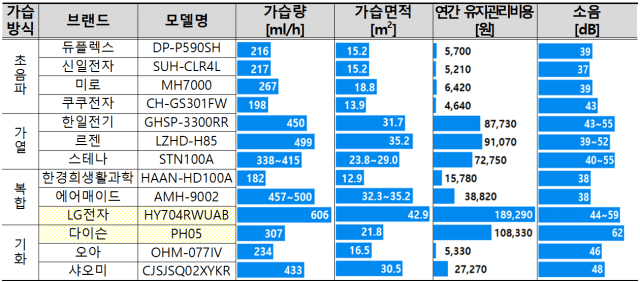 초음파식은 4천640~6천420원, 가열식은 7만2천750~9만1천70원, 기화식은 5천330~10만8천330원, 복합식은 1만5천780~18만9천290원 수준이었다. 다이슨과 LG전자 제품은 공기청정 필터 교체비용이 포함돼 높은 유지비가 산정됐다.