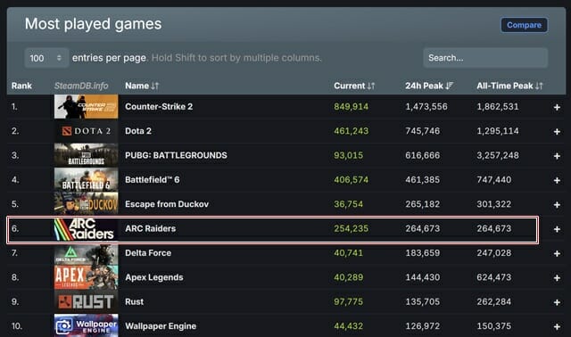 이는 같은 날 스팀 24시간 최고 접속자 순위 기준 '카운터스트라이크2'(147만3천556명)와 '도타2'(74만5천746명), '펍지: 배틀그라운드'(61만6천666명), '배틀필드6'(46만1천385명), '이스케이프 프롬 타르코프'(26만5천182명)에 이어 6위다.