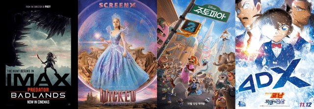 SF 액션 어드벤처 ‘프레데터’ 시리즈 신작과 뮤지컬 영화 ‘위키드’, 디즈니 애니메이션 ‘주토피아’의 속편을 SCREENX·4DX·ULTRA 4DX·IMAX·Dolby Atmos 등 기술 특별관 전 포맷으로 선보인다. 마니아들에게 꾸준히 사랑받는 ‘명탐정 코난: 척안의 잔상’도 SCREENX·4DX·ULTRA 4DX로 재개봉한다.