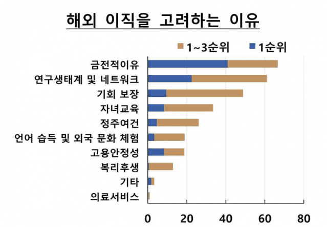 이 뒤를 ▲연구 생태계·네트워크(61.1%) ▲경력기회 보장(48.8%) 등과 같은 비금전적 요인이 이었다.