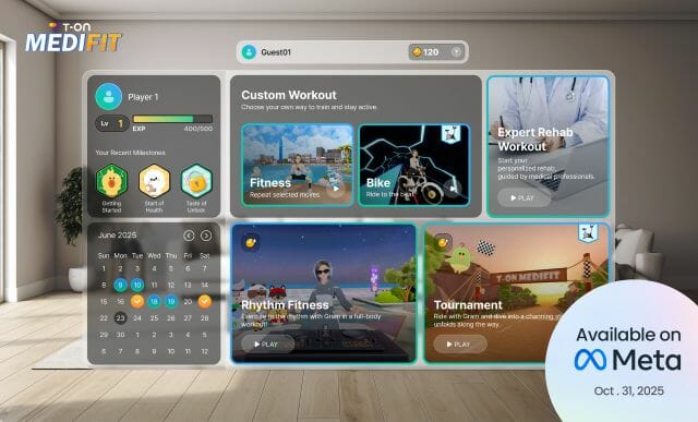 티온 메디핏은 모바일 XR 헤드마운트 디스플레이(HMD) 기반의 메디컬 피트니스 서비스다. 근력 강화 중심의 무산소 운동과 실내 사이클 기반 유산소 운동을 결합한 하이브리드 피트니스 프로그램을 제공한다. 여기에 AI 동작 인식 분석과 실시간 아바타 피드백 기능도 탑재했다.