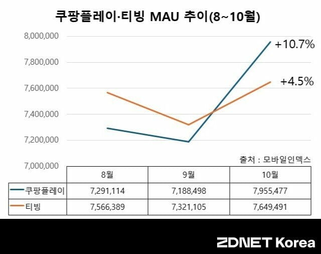 모바일인덱스에 따르면 쿠팡플레이는 10월 월간 활성 이용자(MAU) 795만5천477명을 기록했다. 이는 전월 대비 10.7% 상승한 수치다.