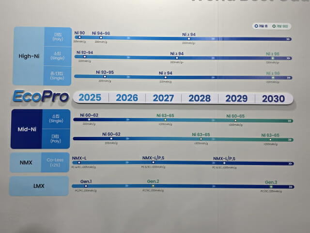 중장기적으로는 고전압 미드니켈, 리튬망간리치(LMR) 등 중저가 배터리용 양극재 신제품 양산을 계획하고 있다고 밝혔다. 최근 국내 배터리셀사들은 2027년을 전후해 고전압 미드니켈, LMR 배터리 양산을 예고한 상황이다.