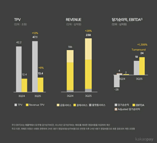 카카오페이가 결제·금융·플랫폼 전 분야의 성장세를 바탕으로 분기 기준 첫 세 자릿수 영업이익을 달성했다. 올해 3분기 매출은 2천384억 원, 영업이익은 158억 원으로 전년 대비 각각 28%, 흑자전환했다. 영업이익률도 6.6%로 한 자릿수 후반대에 진입하며 성장세를 이어갔다.