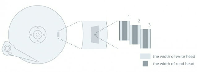 SMR(Shingled Magnetic Recording, 기와식 자기기록) 방식은 트랙 위에 데이터를 하나만 기록하는 것이 아니라 비스듬히 겹치게 여러 번 기록해 단위 면적당 기록되는 용량을 높인다.