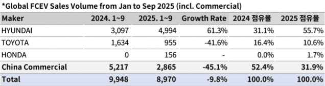 4일 시장조사업체 SNE리서치에 따르면 올해 1월부터 9월까지 글로벌 수소연료전지차(FCEV) 판매량은 전년 동기 대비 9.8% 하락한 총 8천970대를 기록했다.
