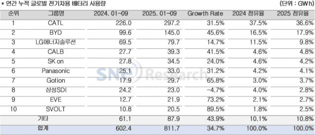 중국 CATL은 전년 동기 대비 31.5%(297.2GWh) 성장하며 글로벌 1위 자리를 유지했다.