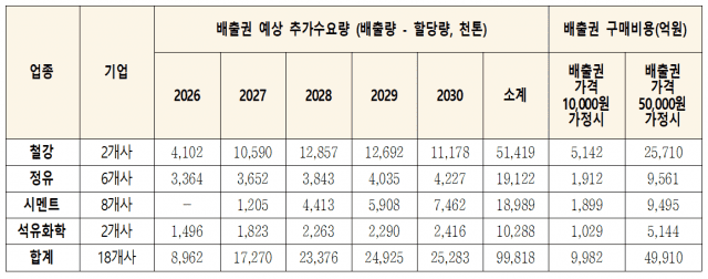 주요 업종별 협회가 4차 계획기간 동안 배출권 추가 구매 부담에 대해 조사(2025년 10월 27일~11월3일)한 결과, 철강 5만1천419천톤, 정유 1만9천122천톤, 시멘트 1만8천989천톤, 석유화학 1만288천톤에 이를 것으로 나왔다.